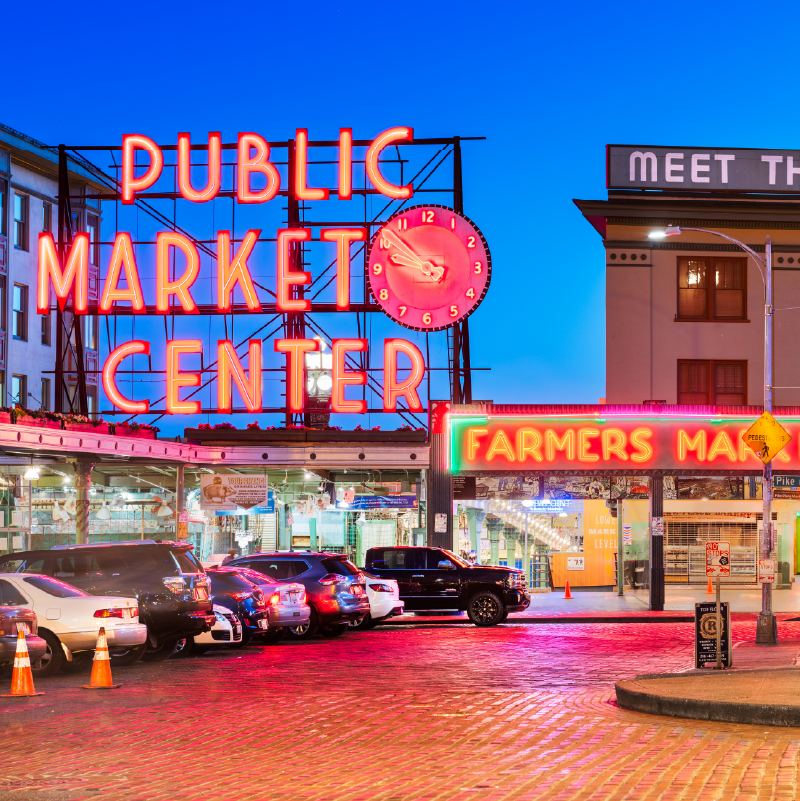 Un clásico que debes visitar es el Pike Place Market, uno de los mercados públicos más antiguos de Estados Unidos. Aquí puedes pasear entre más de 500 puestos donde se venden desde flores frescas hasta productos agrícolas, artesanías, mariscos y delicias locales. Es famoso por el show de los pescadores lanzando fish y por ser el hogar de la primera tienda de Starbucks. Además, encontrarás cafés acogedores y restaurantes con vistas al mar.